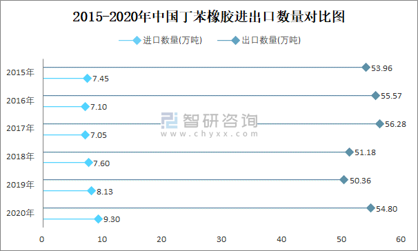 2015-2020年中國丁苯橡膠進出口數量對比統計圖
