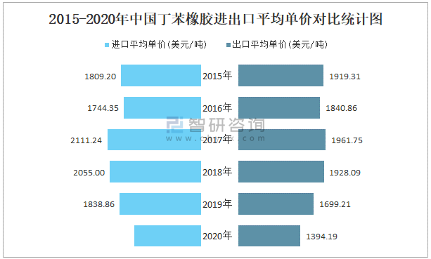 2015-2020年中國丁苯橡膠進出口平均單價對比統計圖
