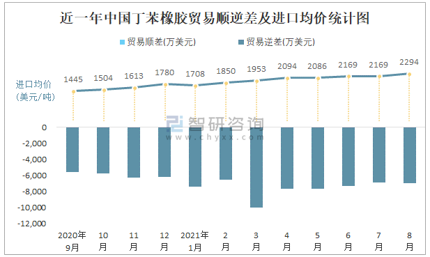 近一年中國丁苯橡膠順逆差及進口均價統計圖