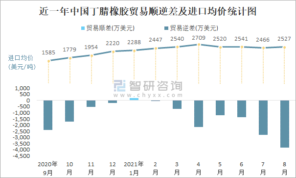 近一年中國丁腈橡膠順逆差及進口均價統計圖