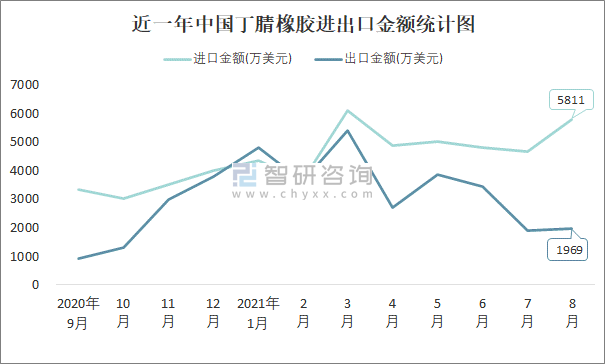近一年中國丁腈橡膠進出口金額統計圖