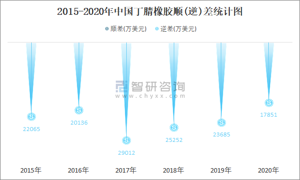 2015-2020年中國丁腈橡膠順(逆)差統計圖