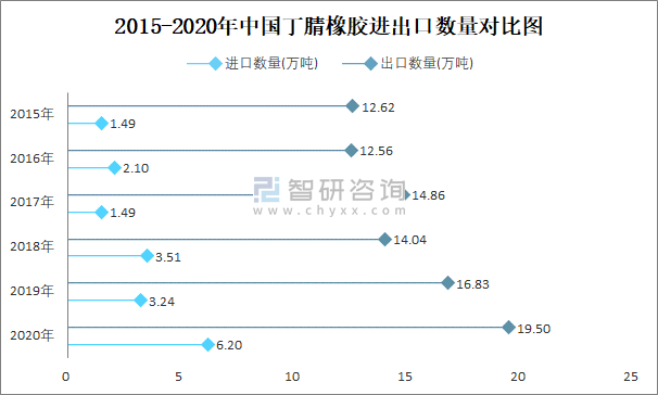 2015-2020年中國丁腈橡膠進出口數量對比統計圖