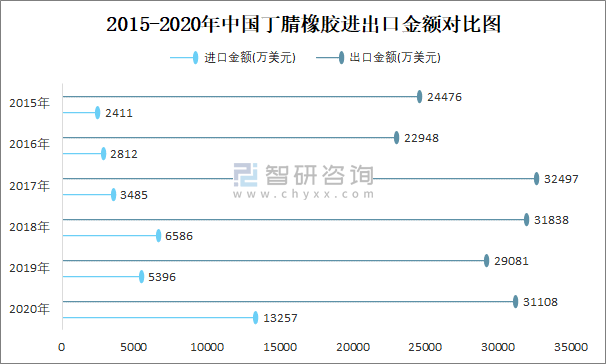 2015-2020年中國丁腈橡膠進出口金額對比統計圖