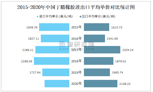 2015-2020年中國丁腈橡膠進出口平均單價對比統計圖