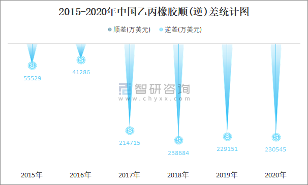 2015-2020年中國乙丙橡膠順(逆)差統計圖