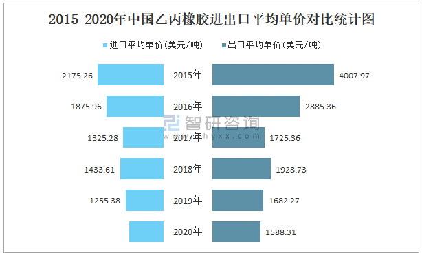 2015-2020年中國乙丙橡膠進出口平均單價對比統計圖