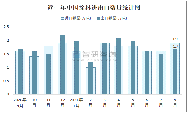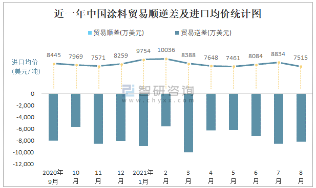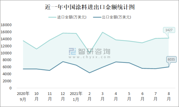根據中國石油和化學工業聯合會數據顯示:2021年8月中國涂料進口數量為1.9萬噸,出口數量為1.7萬噸;進口金額為14278萬美元,出口金額為6035萬美元;近一年中國涂料出口總金額小于進口總金額,貿易逆差為主,8月進口均價7515美元/噸。