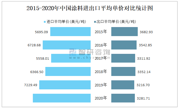 2015-2020年中國涂料進出口平均單價對比統計圖
