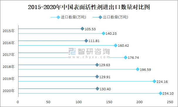 2015-2020年中國(guó)表面活性劑進(jìn)出口數(shù)量對(duì)比統(tǒng)計(jì)圖