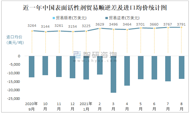 近一年中國(guó)表面活性劑順逆差及進(jìn)口均價(jià)統(tǒng)計(jì)圖