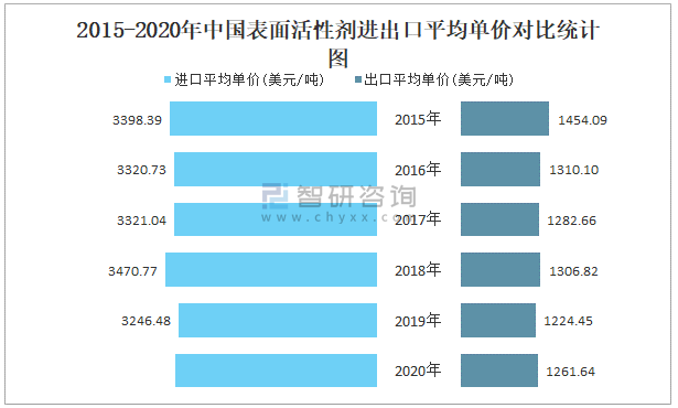 2015-2020年中國(guó)表面活性劑進(jìn)出口平均單價(jià)對(duì)比統(tǒng)計(jì)圖