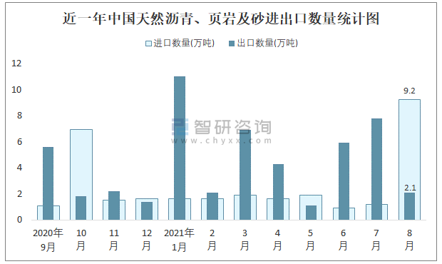 2021年8月中國(guó)天然瀝青、頁(yè)巖及砂進(jìn)出口數(shù)量分別為9.2萬(wàn)噸和2.1萬(wàn)噸