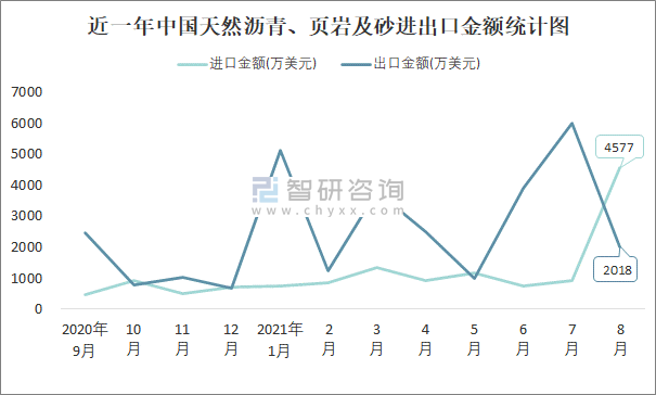 近一年中國(guó)天然瀝青、頁(yè)巖及砂進(jìn)出口金額統(tǒng)計(jì)圖
