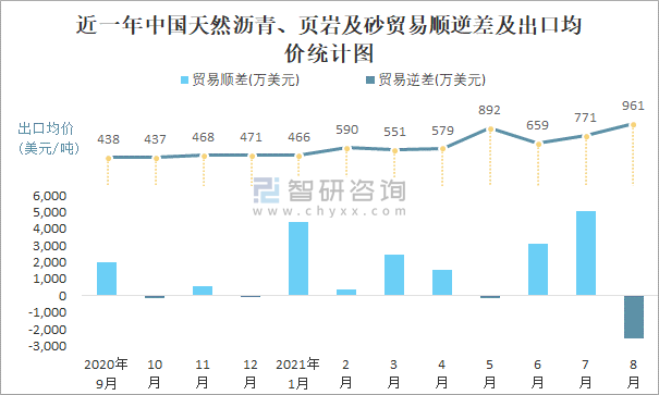 近一年中國(guó)天然瀝青、頁(yè)巖及砂順逆差及出口均價(jià)統(tǒng)計(jì)圖