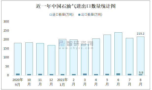 根據中國石油和化學工業聯合會數據顯示:2021年8月中國石油氣進口數量為215.2萬噸,出口數量為5.9萬噸;進口金額為145661萬美元,出口金額為4251萬美元;近一年中國石油氣出口總金額小于進口總金額,貿易逆差為主,8月進口均價677美元/噸。