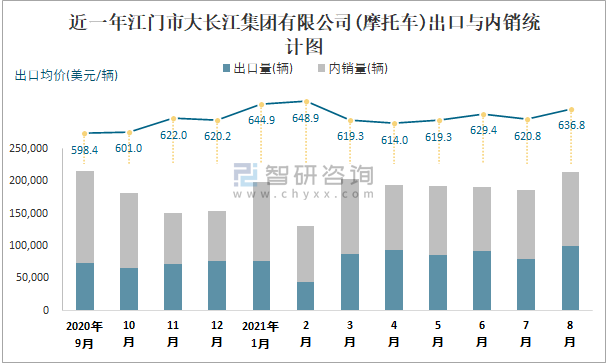 根據中國汽車工業(摩托車)產銷快訊數據統計可知:近一年江門市大長江集團有限公司(摩托車)共清倉庫存94164輛,其產銷率存在一定幅度波動,2月產銷率最高(118.65%),清倉庫存20559輛,2020年12月產銷率偏低(91.87%),積壓庫存13646輛;近一年江門市大長江集團有限公司(摩托車)出口量偏少,銷量以內銷為主,總出口量占比總銷量的43%,出口均價2月達到最高值,此后總體呈現下降趨勢,其中8月出口量為100126輛,出口均價約為636.79美元/輛;2021年1-8月江門市大長江集團有限公司(摩托車)累計出口量為661696輛,同比增長49.34%,累計出口金額約為41538.57萬美元,同比增長57.33%。