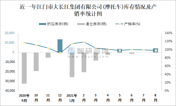 近一年江門市大長江集團有限公司庫存情況及產銷率統計圖