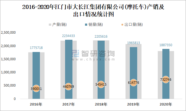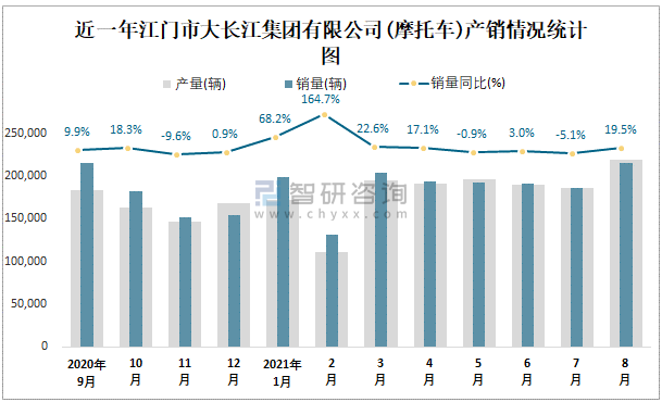 根據中國汽車工業(摩托車)產銷快訊數據顯示:2021年8月江門市大長江集團有限公司(摩托車)產量為219005輛,同比增長18.93%,銷量為214846輛,同比增長19.48%;2021年1-8月江門市大長江集團有限公司(摩托車)累計產量為1459382輛,同比增長26.44%,累計銷量為1510289輛,同比增長27.57%;2016-2020年江門市大長江集團有限公司(摩托車)銷量2017年達到最高值,此后逐年遞減,且近5年總產量大于總銷量,積壓了庫存4683輛,出口量偏少,銷量以內銷為主。