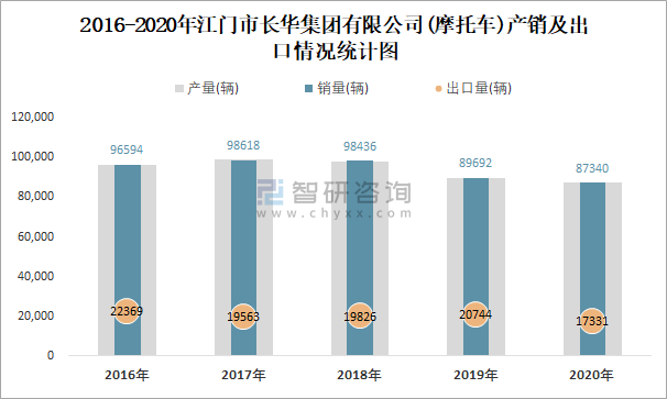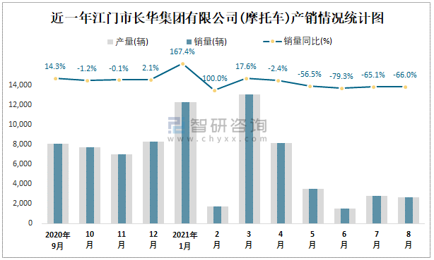 根據中國汽車工業(摩托車)產銷快訊數據顯示:2021年8月江門市長華集團有限公司(摩托車)產量為2655輛,同比下降66.01%,銷量為2655輛,同比下降66.01%;2021年1-8月江門市長華集團有限公司(摩托車)累計產量為45675輛,同比下降18.7%,累計銷量為45675輛,同比下降18.89%;2016-2020年江門市長華集團有限公司(摩托車)銷量2017年達到最大,此后逐年遞減,且近5年總銷量大于總產量,清倉庫存372輛,出口量偏少,銷量以內銷為主。