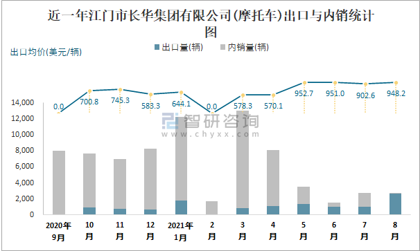 根據中國汽車工業(摩托車)產銷快訊數據統計可知:近一年江門市長華集團有限公司(摩托車)出口量偏少,銷量以內銷為主,總出口量占比總銷量的15.8%,出口均價5月達到最高值,此后總體呈現下降趨勢,其中8月出口量為2626輛,出口均價約為948.21美元/輛;2021年1-8月江門市長華集團有限公司(摩托車)累計出口量為9697輛,同比下降30.37%,累計出口金額約為789萬美元,同比下降30.55%。