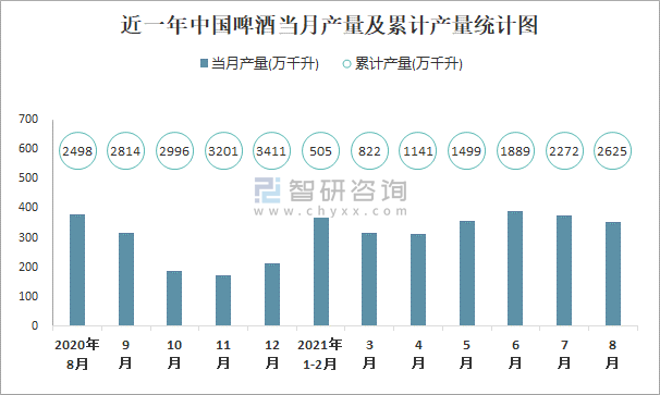 2021年1-8月中國啤酒產量為2625.2萬千升 累計增長5.4%