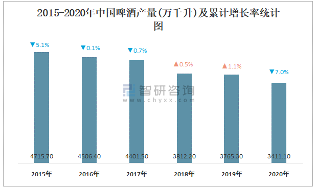 2015-2020年中國啤酒產量及累計增長率統計圖