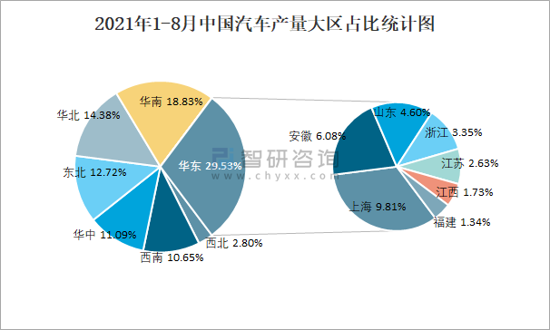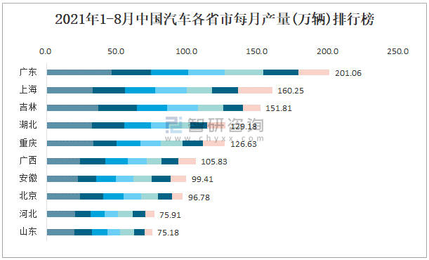 根據國家統計局數據顯示:2021年各季度(第三季度目前暫只統計7月和8月數據)中國汽車主要集中在華東、華南、華北地區生產;2021年1-8月中國汽車產量大區分布相對均衡,其中華東地區產量最高,特別是上海市貢獻了最多產量;2021年1-8月中國汽車各省市產量呈現梯隊式分布,廣東、上海、吉林等省市產量最多。