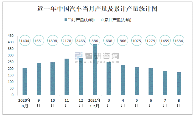 根據國家統計局數據顯示:2021年8月中國汽車產量為173萬輛,同比下降19.1%;2021年1-8月中國汽車累計產量為1634.3萬輛,累計增長13.5%;2015-2020年中國汽車產量2017年起逐年遞減。