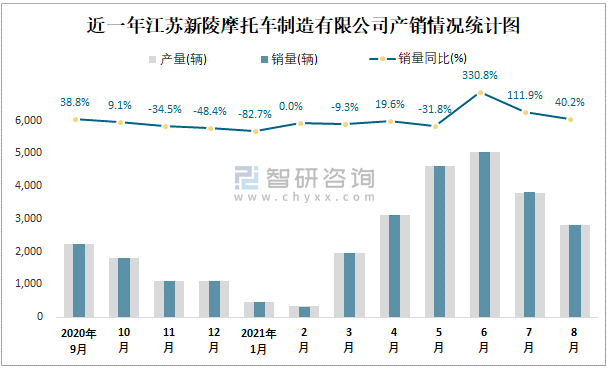 根據(jù)中國汽車工業(yè)(摩托車)產(chǎn)銷快訊數(shù)據(jù)顯示:2021年8月江蘇新陵摩托車制造有限公司(摩托車)產(chǎn)量為2817輛,同比增長40.15%,銷量為2817輛,同比增長40.15%;2021年1-8月江蘇新陵摩托車制造有限公司(摩托車)累計(jì)產(chǎn)量為22108輛,同比增長72.31%,累計(jì)銷量為22098輛,同比增長45.38%;2016-2020年江蘇新陵摩托車制造有限公司(摩托車)產(chǎn)銷量逐年遞增,且近5年總銷量大于總產(chǎn)量,清倉庫存2821輛,2017年起無出口量,以內(nèi)銷為主。
