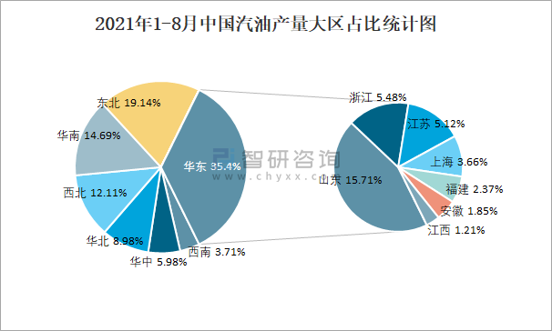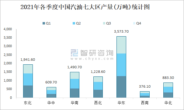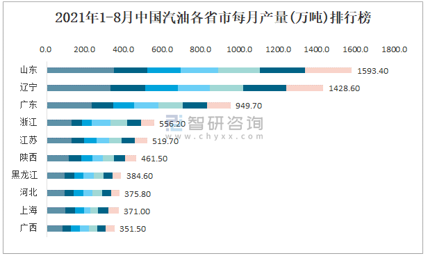 根據國家統計局數據顯示:2021年各季度(第三季度目前暫只統計7月和8月數據)中國汽油主要集中在華東、東北、華南地區生產;2021年1-8月中國汽油產量大區分布不均衡,其中華東地區產量最高,特別是山東省貢獻了最多產量;2021年1-8月中國汽油各省市產量呈現梯隊式分布,山東、遼寧等省產量遠超于其他省份。