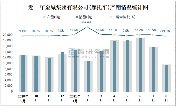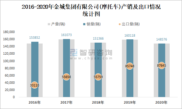 根據中國汽車工業(摩托車)產銷快訊數據顯示:2021年8月金城集團有限公司(摩托車)產量為9574輛,同比下降19.73%,銷量為9327輛,同比下降23%;2021年1-8月金城集團有限公司(摩托車)累計產量為120330輛,同比增長22.92%,累計銷量為120160輛,同比增長23.54%;2016-2020年金城集團有限公司(摩托車)產銷量2017年達到最高值,此后總體呈現下降趨勢,且近5年總銷量大于總產量,清倉庫存7130輛,出口量逐年遞增。