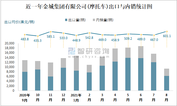 根據中國汽車工業(摩托車)產銷快訊數據統計可知:近一年金城集團有限公司(摩托車)共清倉庫存135輛,其產銷率存在一定幅度波動,2020年12月產銷率最高(105.55%),清倉庫存728輛,8月產銷率偏低(97.42%),積壓庫存247輛;近一年金城集團有限公司(摩托車)總體銷量以出口為主,總出口量占比總銷量的68.8%,出口均價7月起呈現增長趨勢,其中8月出口量為6322輛,出口均價約為601.09美元/輛;2021年1-8月金城集團有限公司(摩托車)累計出口量為85172輛,同比增長55.4%,累計出口金額約為4169.42萬美元,同比增長64.72%。