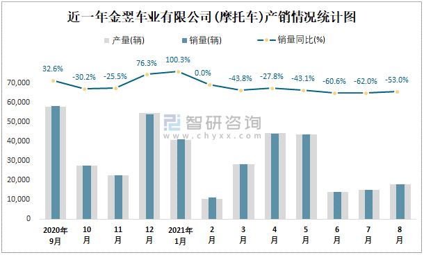 根據(jù)中國(guó)汽車(chē)工業(yè)(摩托車(chē))產(chǎn)銷(xiāo)快訊數(shù)據(jù)顯示:2021年8月金翌車(chē)業(yè)有限公司(摩托車(chē))產(chǎn)量為17856輛,同比下降52.49%,銷(xiāo)量為17802輛,同比下降53.02%;2021年1-8月金翌車(chē)業(yè)有限公司(摩托車(chē))累計(jì)產(chǎn)量為213912輛,同比下降22.57%,累計(jì)銷(xiāo)量為214575輛,同比下降22.31%;2016-2020年金翌車(chē)業(yè)有限公司(摩托車(chē))產(chǎn)銷(xiāo)量2018年跌至最低值,此后逐年遞增,且近5年總產(chǎn)量大于總銷(xiāo)量,積壓了庫(kù)存1176輛,出口量偏少,銷(xiāo)量以?xún)?nèi)銷(xiāo)為主。