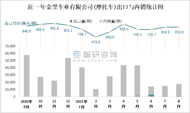 根據(jù)中國(guó)汽車(chē)工業(yè)(摩托車(chē))產(chǎn)銷(xiāo)快訊數(shù)據(jù)統(tǒng)計(jì)可知:近一年金翌車(chē)業(yè)有限公司(摩托車(chē))共清倉(cāng)庫(kù)存62輛,其產(chǎn)銷(xiāo)率波動(dòng)幅度不大,2月產(chǎn)銷(xiāo)率最高(104.62%),清倉(cāng)庫(kù)存484輛,2020年12月產(chǎn)銷(xiāo)率偏低(98.72%),積壓庫(kù)存695輛;近一年金翌車(chē)業(yè)有限公司(摩托車(chē))出口量偏少,銷(xiāo)量以?xún)?nèi)銷(xiāo)為主,總出口量占比總銷(xiāo)量的2.6%,出口均價(jià)2月跌至最低值,此后總體呈現(xiàn)上升趨勢(shì),其中8月出口量為872輛,出口均價(jià)約為810.78美元/輛;2021年1-8月金翌車(chē)業(yè)有限公司(摩托車(chē))累計(jì)出口量為7573輛,同比增長(zhǎng)76.53%,累計(jì)出口金額約為566.36萬(wàn)美元,同比增長(zhǎng)37.45%。