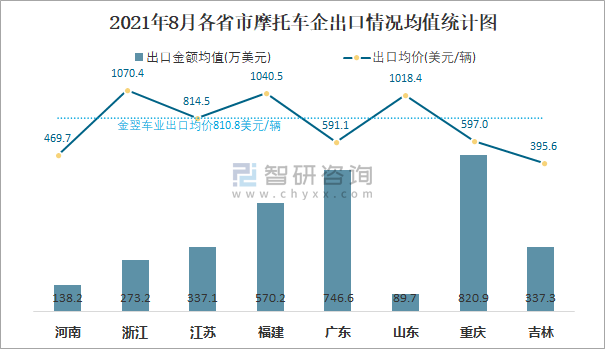 2021年8月各省市摩托車(chē)企出口情況均值統(tǒng)計(jì)圖