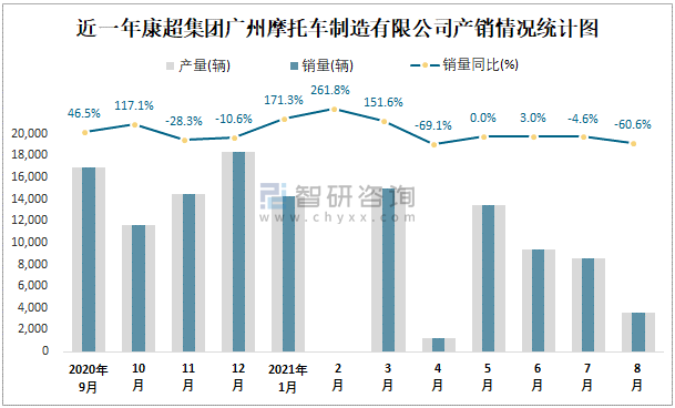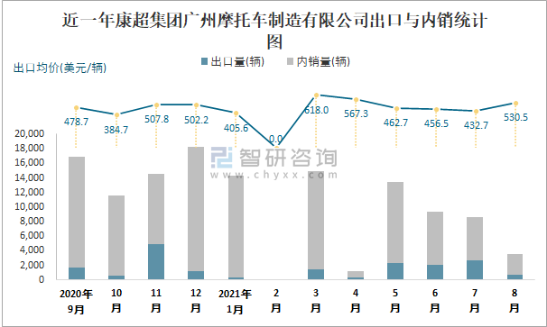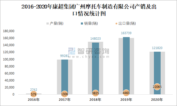 根據(jù)中國汽車工業(yè)(摩托車)產(chǎn)銷快訊數(shù)據(jù)顯示:2021年8月康超集團(tuán)廣州摩托車制造有限公司(摩托車)產(chǎn)量為3565輛,同比下降60.05%,銷量為3563輛,同比下降60.59%;2021年1-8月康超集團(tuán)廣州摩托車制造有限公司(摩托車)累計(jì)產(chǎn)量為65437輛,同比增長8.54%,累計(jì)銷量為65438輛,同比增長8.2%;2016-2020年康超集團(tuán)廣州摩托車制造有限公司(摩托車)產(chǎn)銷量2019年達(dá)到最高值,此后有所下滑,且近5年總產(chǎn)量大于總銷量,積壓了庫存27輛,出口量偏少,銷量以內(nèi)銷為主。
