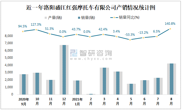 近一年洛陽盛江紅強(qiáng)摩托車有限公司產(chǎn)銷情況統(tǒng)計圖
