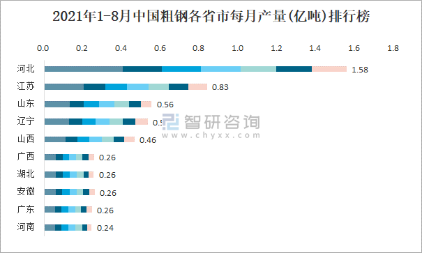 2021年1-8月中國粗鋼各省市每月產(chǎn)量排行榜