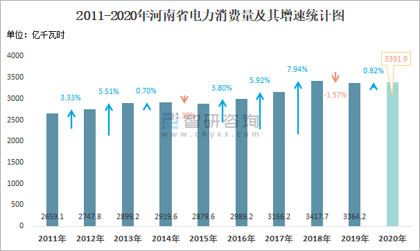 2011-2020年河南省電力消費(fèi)量及其增速統(tǒng)計(jì)圖