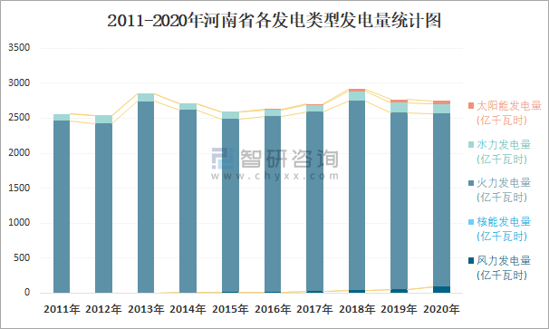 2011-2020年河南省各發(fā)電類型發(fā)電量統(tǒng)計(jì)圖
