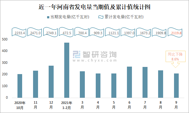 近一年河南省發(fā)電量當(dāng)期值及累計(jì)值統(tǒng)計(jì)圖