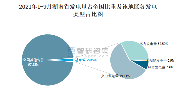 2021年1-9月湖南省發電量占全國比重及該地區各發電類型占比圖