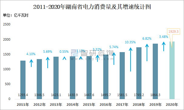 2011-2020年湖南省電力消費量及其增速統計圖