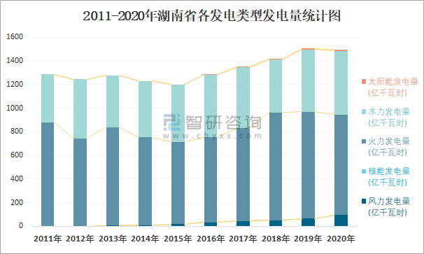 2011-2020年湖南省各發電類型發電量統計圖