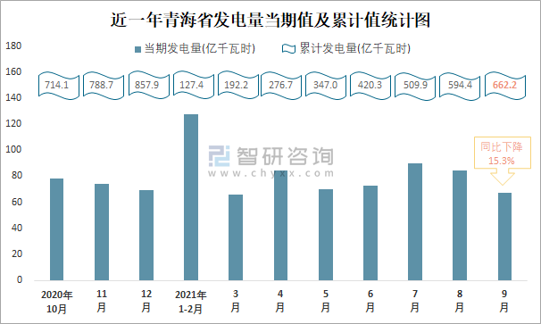 近一年青海省發(fā)電量當(dāng)期值及累計值統(tǒng)計圖