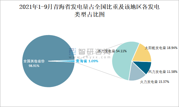2021年1-9月青海省發(fā)電量占全國比重及該地區(qū)各發(fā)電類型占比圖