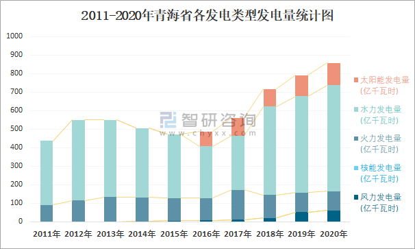 2011-2020年青海省各發(fā)電類型發(fā)電量統(tǒng)計圖