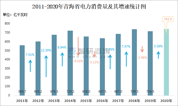 2011-2020年青海省電力消費量及其增速統(tǒng)計圖