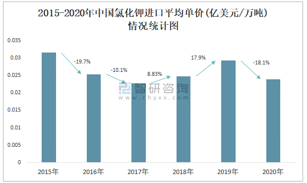 根據中國海關數據顯示:2015-2020年中國氯化鉀進口數量均在2016年跌至最低值,此后有所回升,進口金額2017年跌至最低值,此后有所上升;2015-2020年中國氯化鉀進口平均單價2019年增長速度最快,而2016年中國氯化鉀進口平均單價下降速度最快,下滑了19.7%。